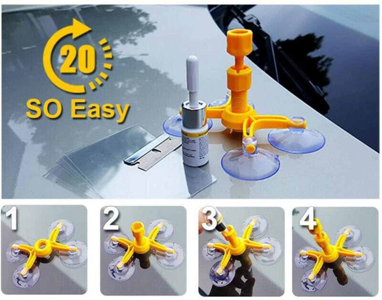Cracked Glass Repair Kit is designed to repair glass damages including bulls-eye, cracks, spider web, star damages, and some combination breaks only in 20 minutes.
