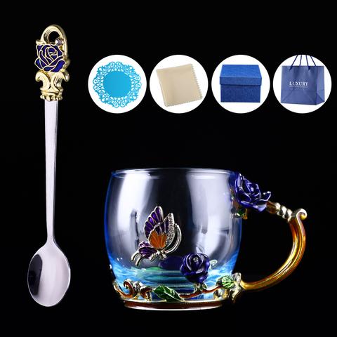 PERFECT HANDMADE ENAMEL CUP: The handmade enamel glass cup has an elegant style with butterfly and rose flower 3D designs. There are no cups exactly like yours in the world. Yours is only one and will never fade as time passed, even if you use the mug daily. The glass material of the cup is glittering and translucent, classic but refined and the noble stylish look is functional yet decorative.